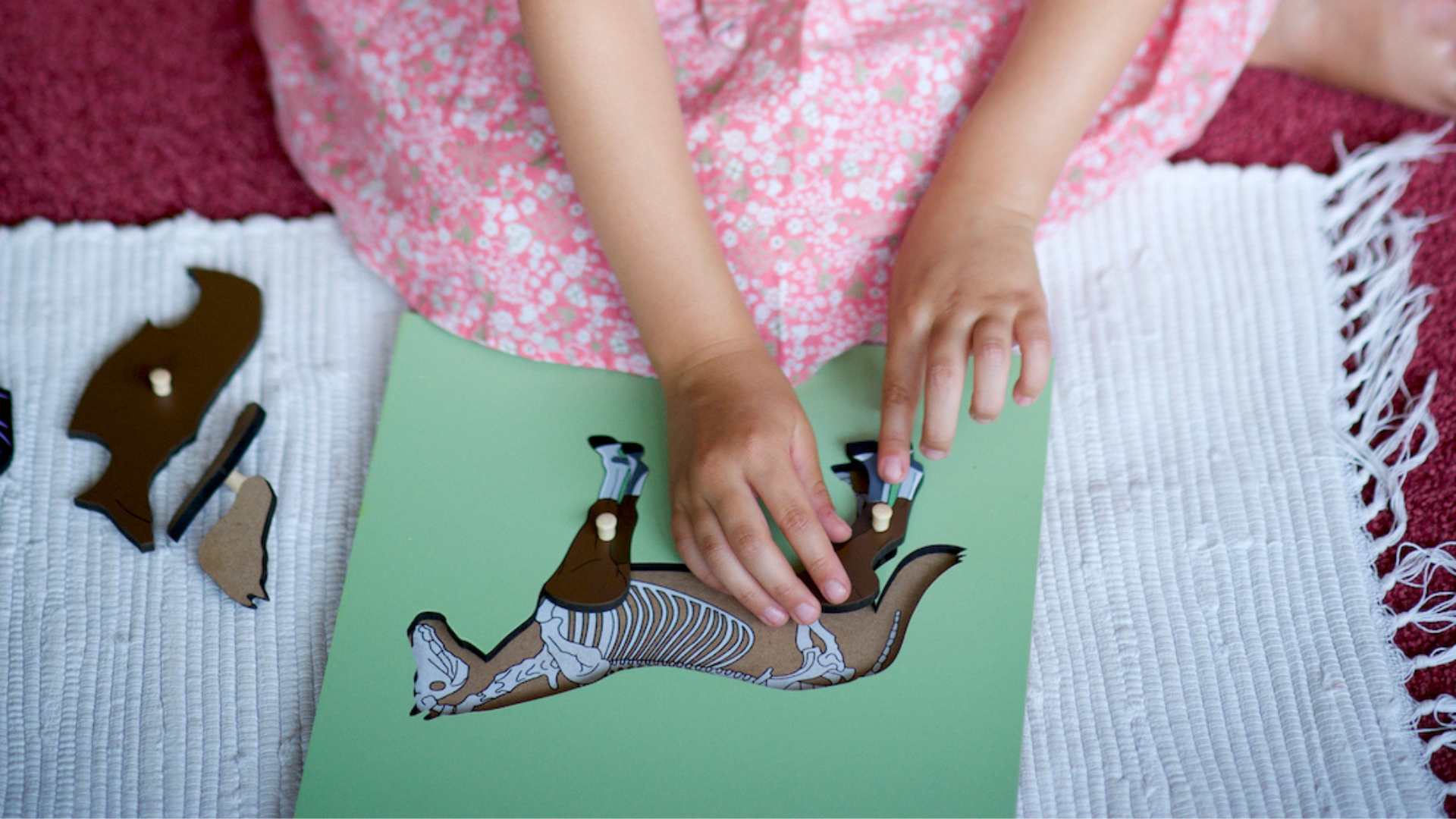 Typické Montessori puzzle je vložené do dřevěné destičky a jednotlivé dílky jsou opatřeny malými úchyty pro snadnější manipulaci a rozvoj špetkového úchopu. Biologické a zoologické puzzle umožní dítěti poznat části těl (ať už rostlin nebo zvířat) prostřednictvím zraku i hmatu. Dítě při práci s tímto druhem puzzle vnímá reálnou podobu zvířete nebo rostliny a také správné velikostní poměry mezi jednotlivými částmi. Máme puzzle bez kostry a puzzle s kostrou - to jsou taková puzzle, kdy po odebrání všech dílků zůstane na základně vyobrazená kostra daného zvířete. Práce s těmito puzzle rozvíjí mimo jiné i jazyk - rozšiřuje slovní zásobu dítěte.